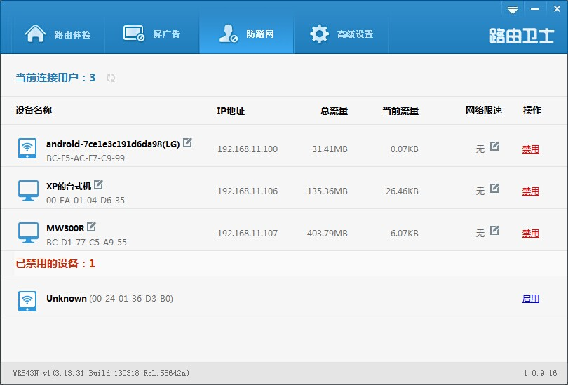 打开防蹭网界面,可以检测到当前连接您路由器的用户,点击右边的“禁用”或“启用”,连接用户随您选!防蹭网功能可增强WiFi安全,随时监控无线连接用户,让隔壁蹭网大叔无可遁形!