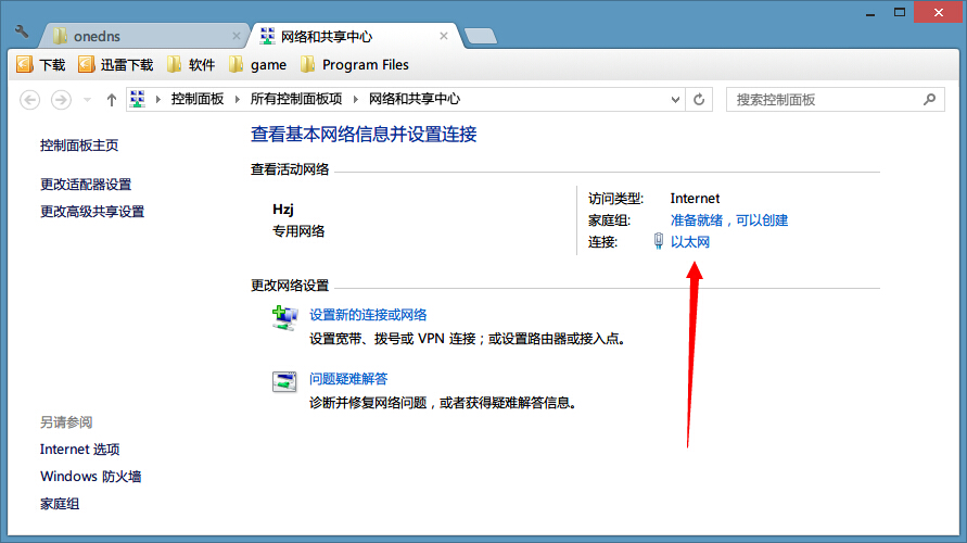 2.在右侧的查看活动网络中,单击当前已连接的网络。(如果你有多个网络连接,请选择当前正在使用的连接。)