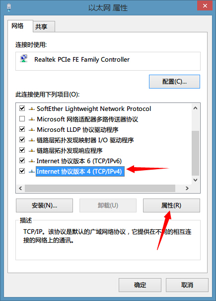 4.选择中Internet 协议版本 4 (TCP/IPv4),再单击属性。
