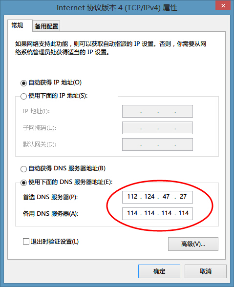 5.选择使用下面的 DNS 服务器地址,在首选 DNS 服务器中填写的112.124.47.27和在备用 DNS服务器中填写114.114.114.114或者您的ISP提供的备用DNS地址。