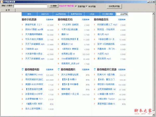 EV网盘搜索神器可以搜索网盘分享的电影、音乐、文档、软件、种子等资源,工具搜索排名前五的网盘是百度网盘、115网盘、华为网盘、纳米盘、360网盘、输入关键就可以搜索,可以搜索到文件名、文件大小、分享者、分享时间、下载次数、以及资源详情等信息,双击列表中任意文件即可打开资源链接。