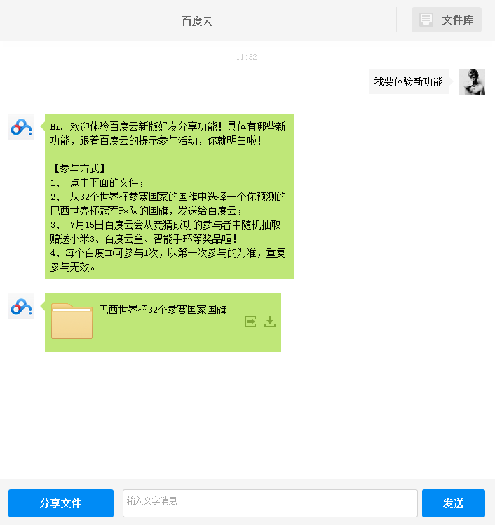 第三步、发送“我要体验新功能”参加活动。