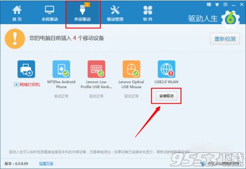 5、更新网卡驱动程序:利用“驱动人生”或“驱动精灵”将无线网卡驱动升级至最新。在此以“驱动人生”为例,切换至“外设驱动”选项卡,点击“无线网卡安装驱动”按钮。