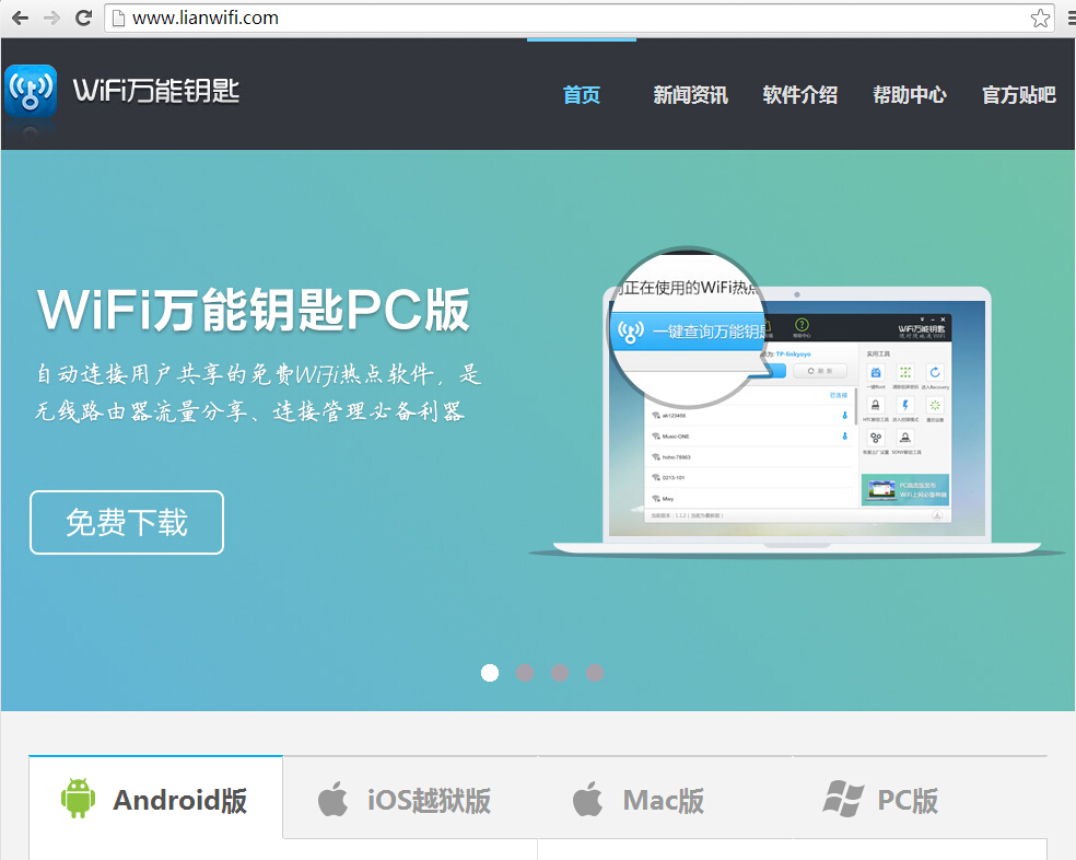 1. 在WiFi万能钥匙官网点击下载PC版;