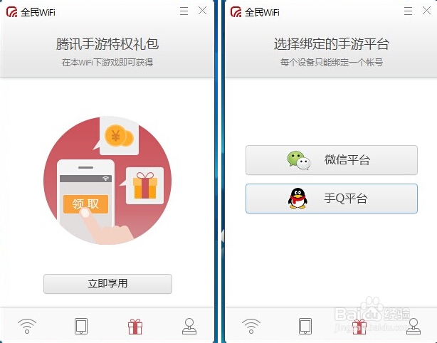 答:安装成功后,可以点击电脑全民WiFi客户端的礼包图标,通过绑定微信或QQ帐号,每个设备只能绑定一次,无法修改,绑定成功后即可获取相应的游戏特权礼包