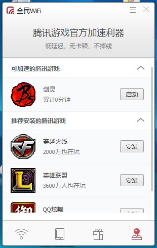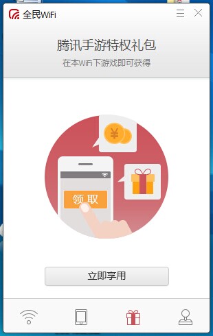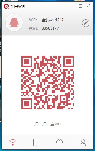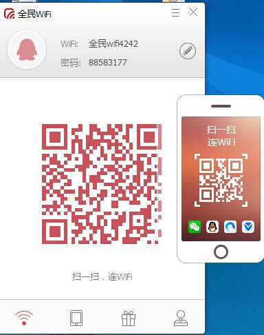 腾讯全民wifi其实也可以叫做腾讯随身wifi、qqwifi,不仅可以将电脑一秒变成wifi热点,而且还拥有游戏加速、游戏礼包等诱人功能,如果你想连接wifi,直接扫扫二维码就能连接,对于广大用户来说,是绝对的福利啊!
