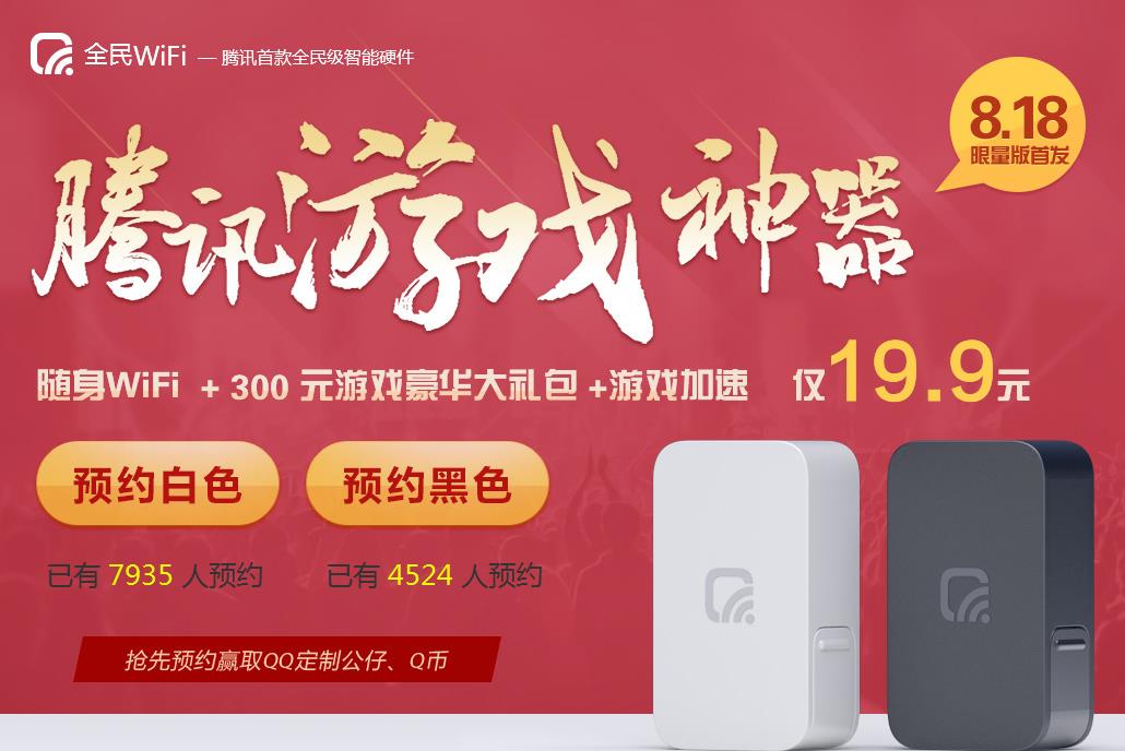 腾讯全民WiFi正式在京东开启预约,预约时间即日起至8月17日,8月18日限量首发,售价为19.9元,并赠送价值300元的游戏“豪华大礼包”。据了解,在全民WiFi下玩指定游戏(包括全民飞机大战、全民小镇、节奏大师等),即可获得相关道具和礼包。