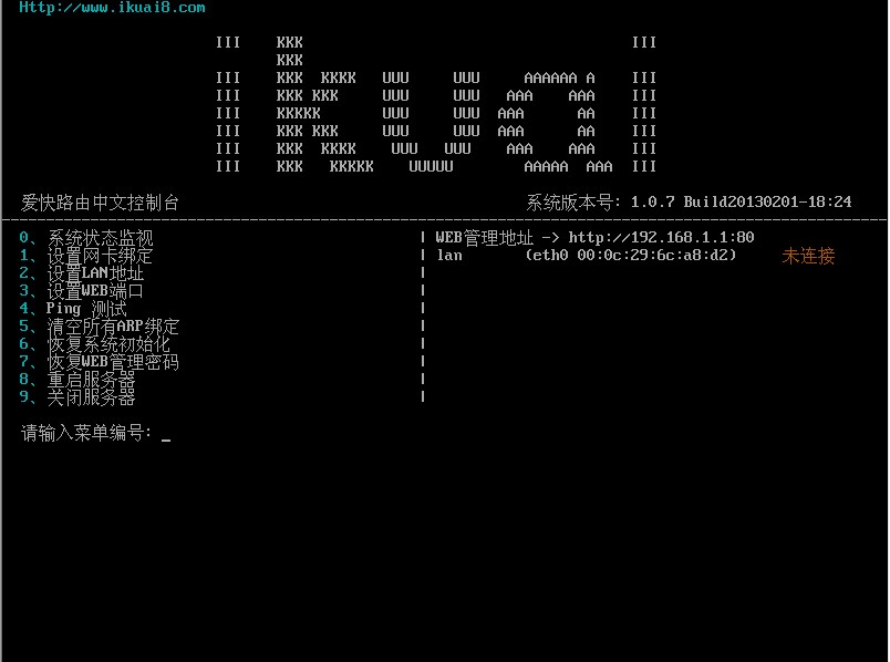 安装好后,将网线接到网卡上去,在控制台上按一下回车,lan 显示“已连接”,就表示网线接对了。