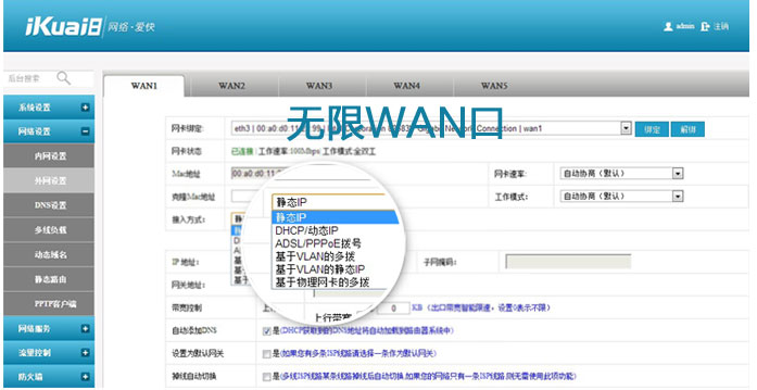 爱快不限制wan口数量,也支持vlan多拨,和物理网卡多拨。