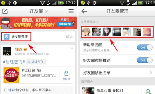 1、打开新浪微博软件,进入朋友圈界面,点击“好友圈管理”按键,在进入好友圈管理界面后,按“成员管理”按键。