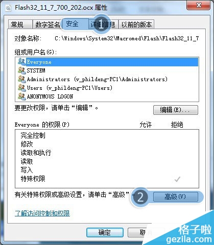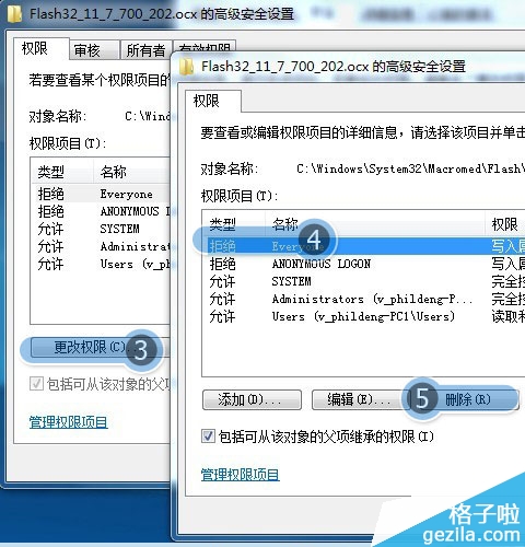 2. 打开文件夹C:\Windows\System32\Macromed\Flash 将名为"Flash32_版本号.ocx" 文件删除(如果无法删除请右键文件点击【属性】→【安全】→【高级】→【更改权限】→将前两项拒绝权限删除后点击【确定】后,再将QQ、腾讯电脑管家、浏览器关闭后即可删除文件):