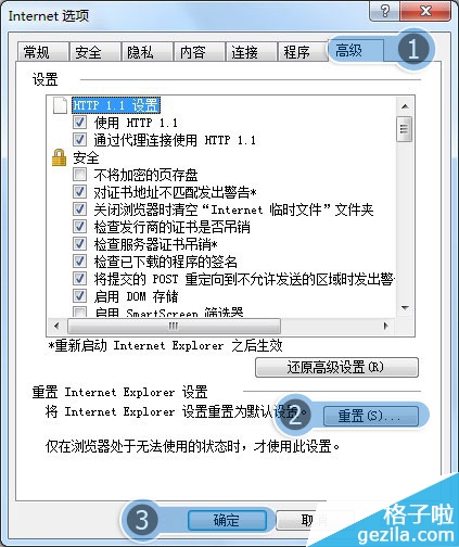 2 点击【高级】→点击【重置】→勾选【删除个性化设置】→点击【确定】→【确定】: