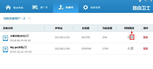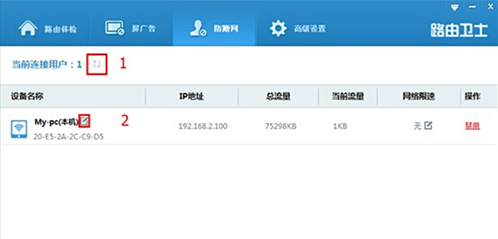 2、进入防蹭网功能窗口,软件会自动刷新当前连接路由器的用户,也可以单击图片中红圈1来更新当前连接用户列表。列表中我们可以给已知的设备做上标记,点击图片中红圈2可以修改设备名称。