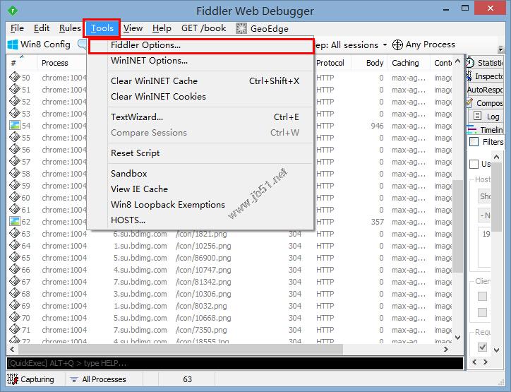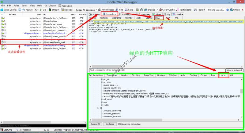 接下去就是Fiddler的基本操作了,我们已经看到手机上的数据包了。