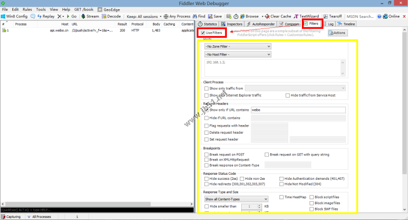 提示:Fiddler可以设置过滤,可以很方便看到我们想要的Http包: