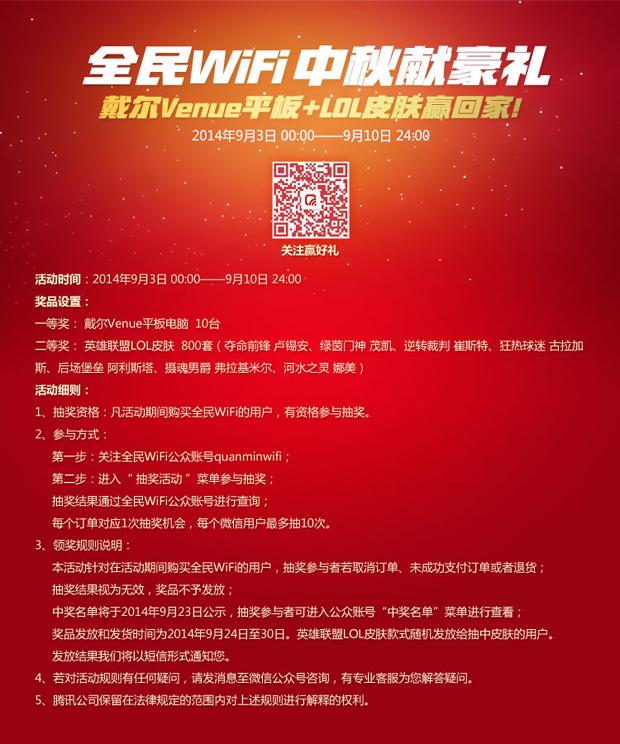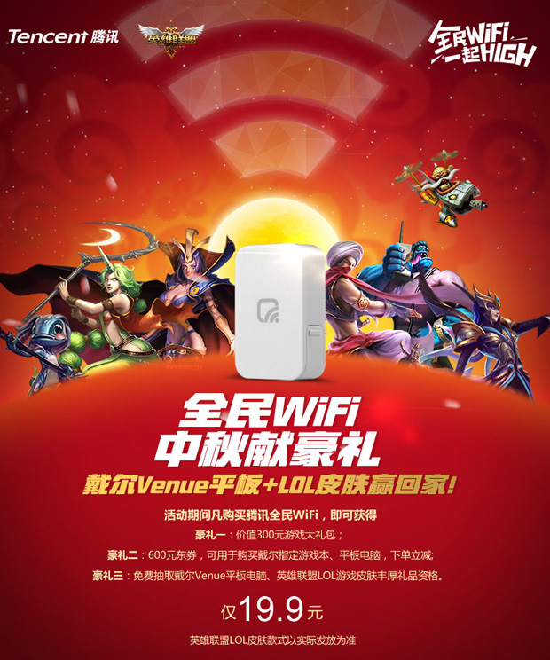 中秋佳节即将来临,现在就购买腾讯全民wifi参与活动即可免费获得戴尔Venue平板和lol英雄联盟精美皮肤。