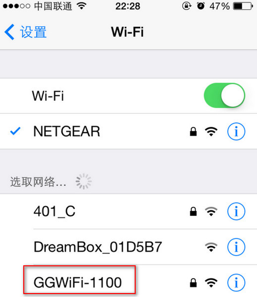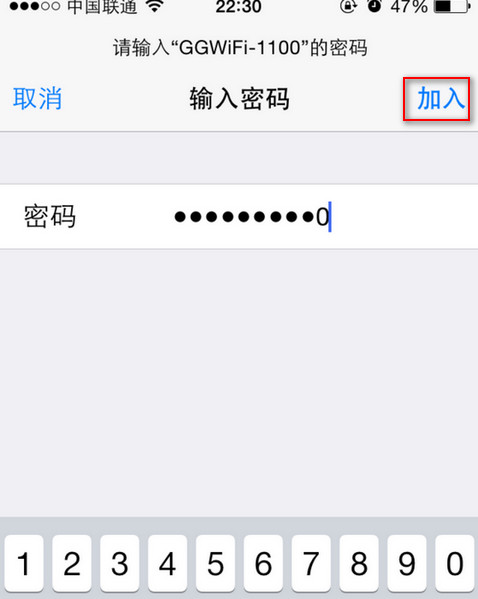 如图所示,此时WiFi共享大师创建的WiFi名称为:GGWiFi-1100。下面以苹果手机为例,打开手机中的“设置”,点击“Wi-Fi”,这是可以看到搜到附近的热点,在其中找到上面的“GGWiFi-1100”,然后点击下,这是会弹出要求输入密码的对话框,这是你就将WiFi共享大师界面中的那个“1234567890”的密码输入进入,最后点击“加入”,就可以连接WiFi共享大师了。