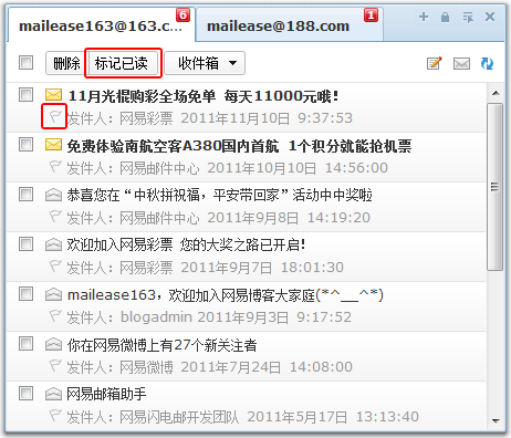 2、颜色标签:在邮件列表,点击某封邮件发信人前面的小旗帜图标,可将邮件主题标记为红色/默认颜色。
