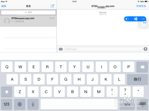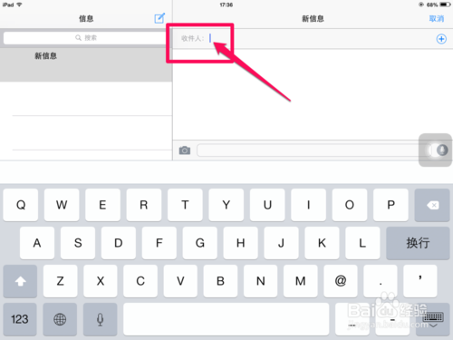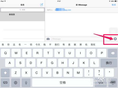 3、输入接收方的iMessage帐号,苹果平板电脑只能给苹果设备发信息哦。