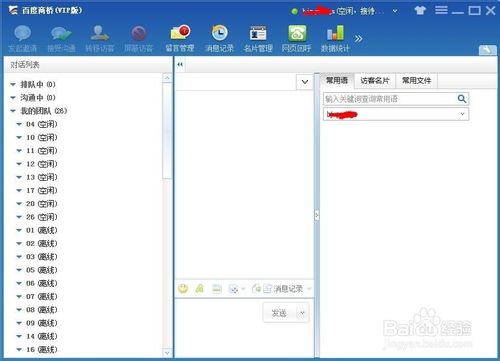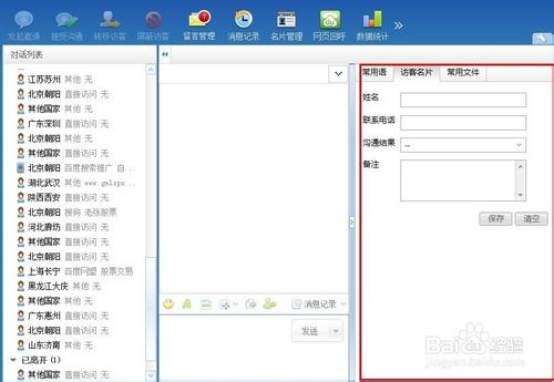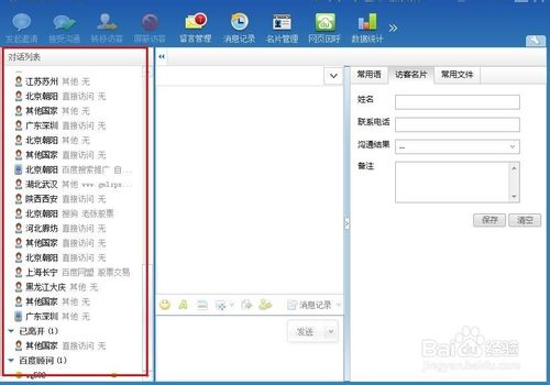 4、左边是“对话列表”,显示正在访问的访客以及一些访问记录。
