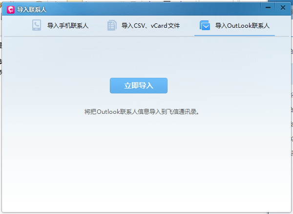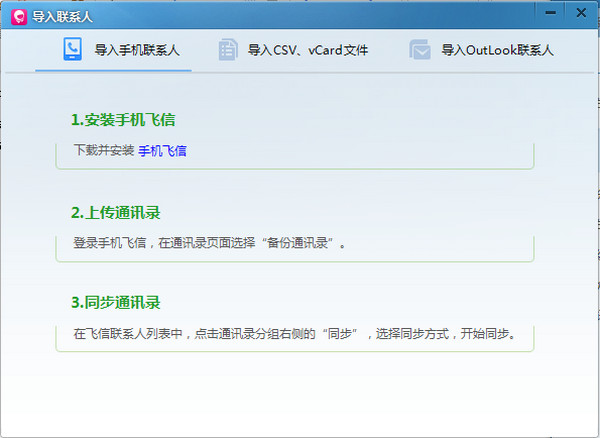 在飞信2014通讯录的右边有个导入按钮,打开之后就可以看到联系人导入向导,一共三种方式,大家可以按照向导提示进行操作!