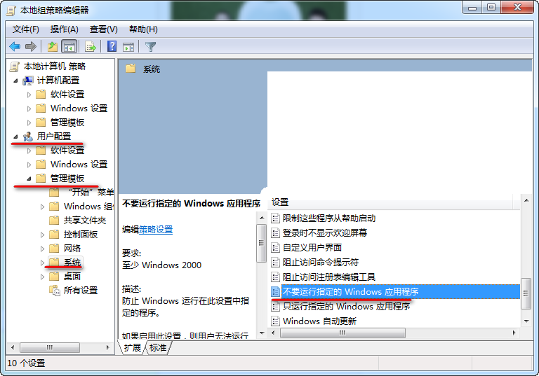 2、组策略--用户配置--管理模板--系统--不要运行指定的Windows应用程序 --已禁用