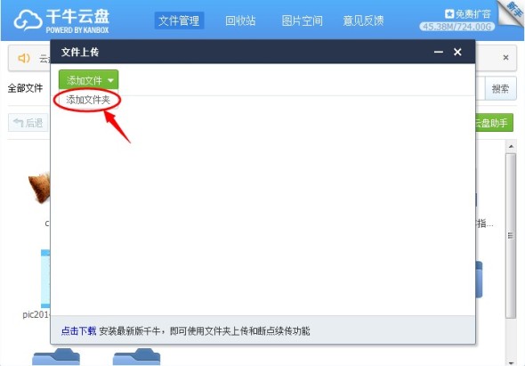 点击上传,鼠标移至“添加文件”按钮,就会出现“添加文件夹”选项。