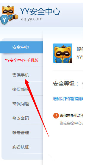 步骤四:进入首页后,在左侧找到密保手机,点击。