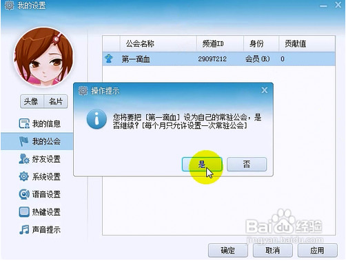 步骤四:单击“设置常驻公会”后会弹出一个让你确认是否将XX公会设置为常驻公会的提示框,如下图所示,然后选择“是”这个选项。