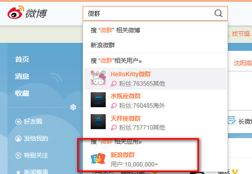 步骤二:进入微博首页之后,在搜索框中输入微群二字,在最下方便出现了微群应用。