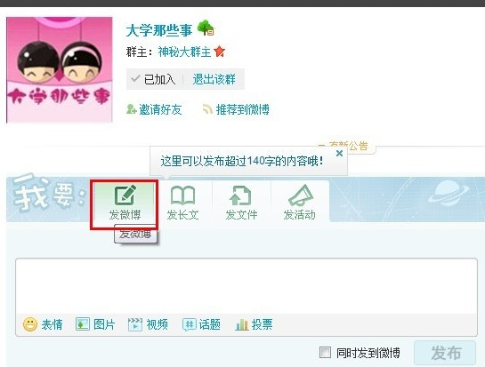 步骤四:由于只能在加入的微群里发微博,进入之后可以点击发布微博按钮,在微博框中输入你想输入的文字,这里跟发布常规微博一样,可以插入图片,编辑之后点击发布即可,如图所示。
