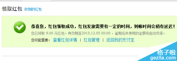 8、确认领取额以后,红包就落入大家的支付宝当中啦!该红包可以用于淘宝消费以及微博支付,不能够充值或是提现的哦!