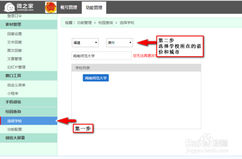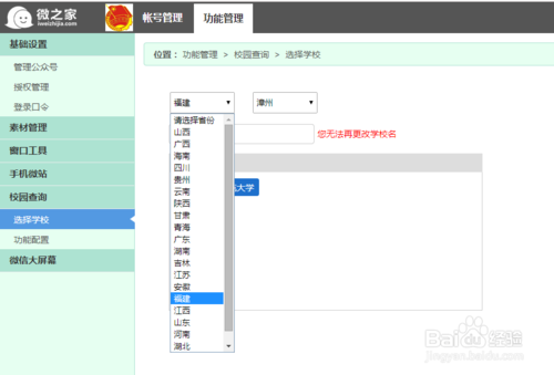3、第三步:点击进入校园查询一栏的选择学校,然后选择自己学校所在的省份和城市,选中自己的学校名称,然后点击功能配置,选择想要开通的校园查询的功能。