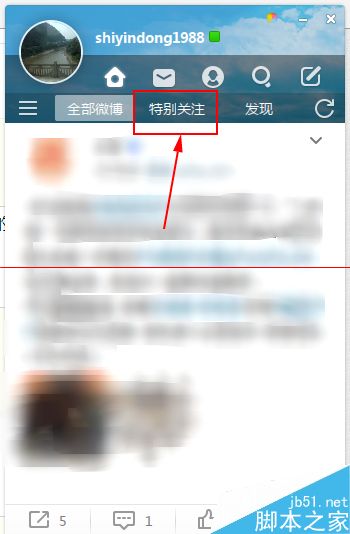 2、在微博桌面的主页当中,默认显示的是全部微博内容,我们点击旁边的“特别关注”选项就可以啦。