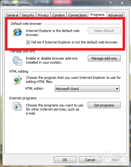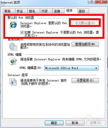 9、首先将IE浏览器设置成默认浏览。请尝试打开Outlook邮件中的网页链接,如果还是不能打开请继续下面的步骤。