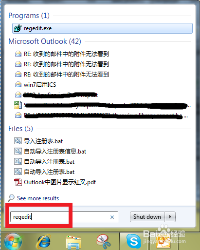 2、点击左下角的“开始”,在运行或搜索栏中输入"regedit",点击回车键