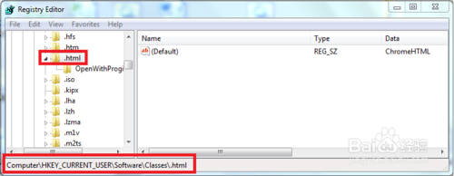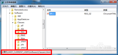 3、弹出“注册表编辑器”,找到如下的路径:[HKEY_CURRENT_USER \Software \classes \.html]