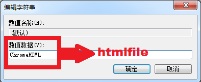 5、出现“编辑字符串”界面,在“数值数据”中将"ChromeHTML"或"360seURL"改成htmlfile