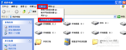 1、首先介绍的是XP系统的解决方法。打开“我的电脑”,点击菜单栏的“工具”,选择“文件夹选项”,如图