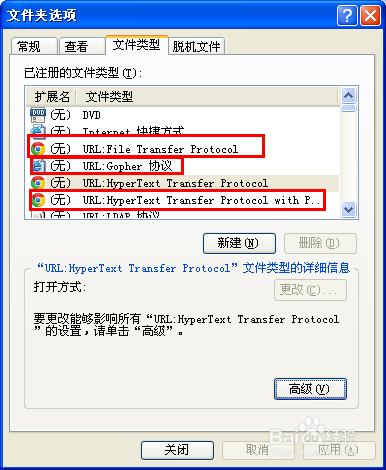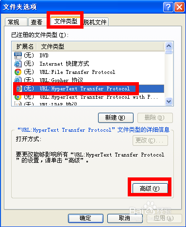 2、出现“文件夹选项”界面,点击“文件类型”,选中"URL:HyperText Transfer Protocol”,点击右下角的“高级”,如图