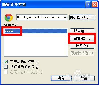 3、出现“编辑文件类型”界面,点击操作中"open",再点击“编辑”
