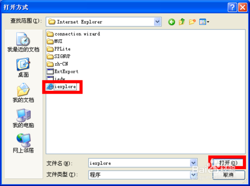 4、在出现的窗口中,再点击“浏览”,找到以下路径:C:\Program Files\Internet Explorer,选中"iexplore.exe",点击打开