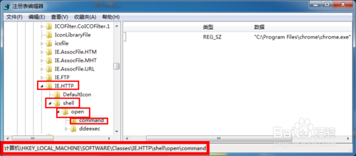 11、弹出“注册表编辑器”,找到以下路径:Windows7系统找到以下路径:[HKEY_LOCAL_MACHINE \Software \Calsses\IE.HTTP \shell \open \command]