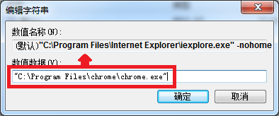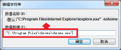 2)出现“编辑字符串”界面,将“数值数据”修改为:"C:\Program Files\Internet Explorer\iexplore.exe" -nohome