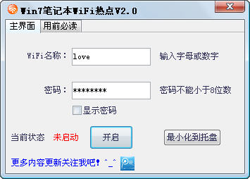先把这个软件下载好,然后解压放到桌面,打开软件,WiFi名称和密码可以修改,点[开启WiFi],笔记本电脑就发射出WiFi啦,拿手机来连接吧。没有比这个更简单绿色的了。