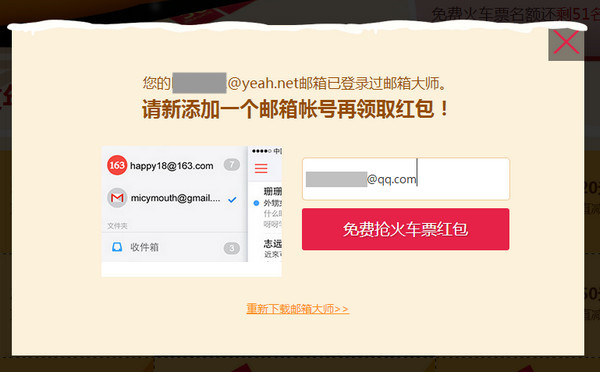 5.输入你登录邮箱大师的账号,点击【免费抢火车票红包】