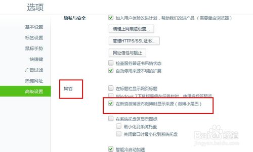 4、拉动滚动条一直最下,看到有个“其它”,其它右边有个“在新浪微博发布微博时显示来源(微博小尾巴)”的选项,默认前面是打勾的: