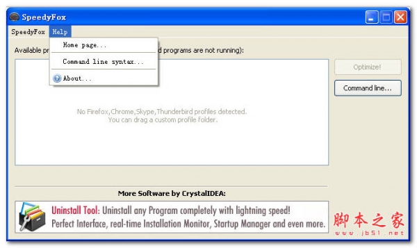 双击运行SpeedyFox,选择Firefox的配置文件,点击“Optimize!”按钮即可。“command line…”是关于启动Firefox的命令行,可以不用去理会它。