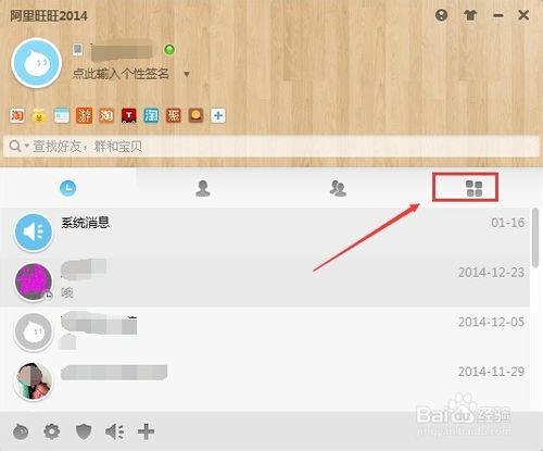 3、登录成功后,在阿里旺旺主界面上点击导航右侧的应用图标,如下图所示。