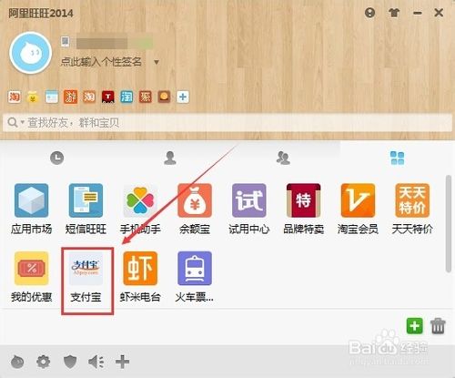 4、在阿里旺旺应用选项卡里找到支付宝,点击支付宝,如下图所示。